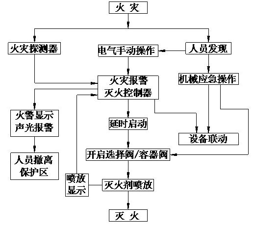 當(dāng)兩種探測(cè)器發(fā)出火災(zāi)信號(hào)時(shí),控制主機(jī)啟動(dòng)警鈴和聲光報(bào)警器,聯(lián)動(dòng)關(guān)閉防護(hù)區(qū)開(kāi)口,進(jìn)入滅火啟動(dòng)延時(shí),達(dá)到設(shè)定的延時(shí)時(shí)間后,自動(dòng)啟動(dòng)滅火系統(tǒng)。